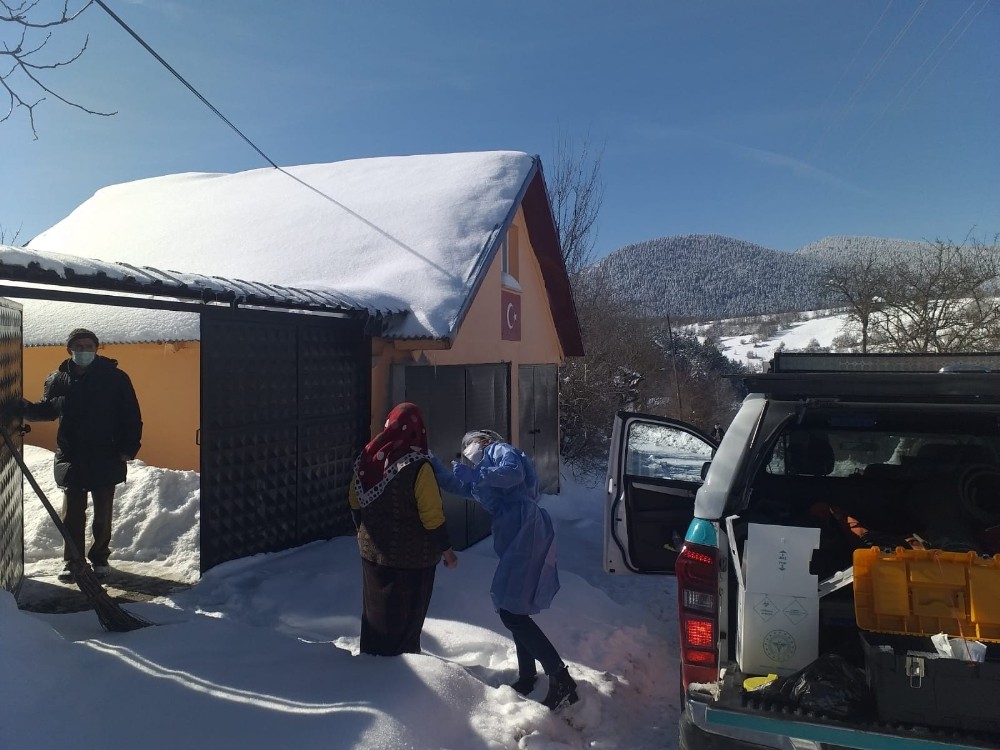 Karabük’te sağlık ekipleri karla kaplı köylerde hafta sonu aşılama çalışmalarını sürdürdü. 85 yaş ve üzeri yaşlılar ile evde sağlık hizmetlerinden faydalanan hastalara mobil sağlık ekipleri tarafından evlerinde aşı uygulandı.